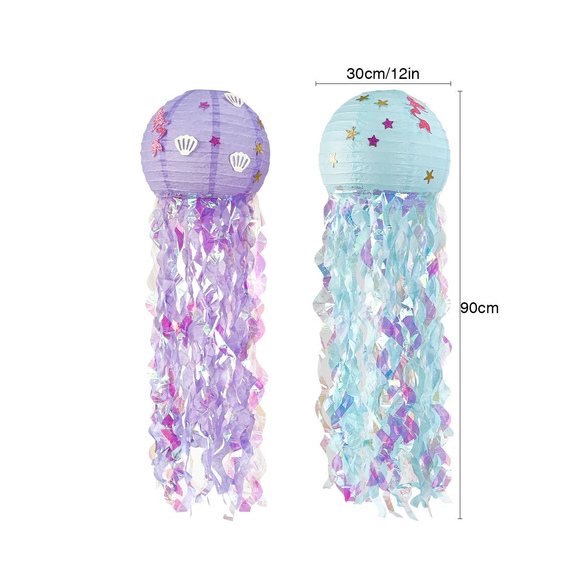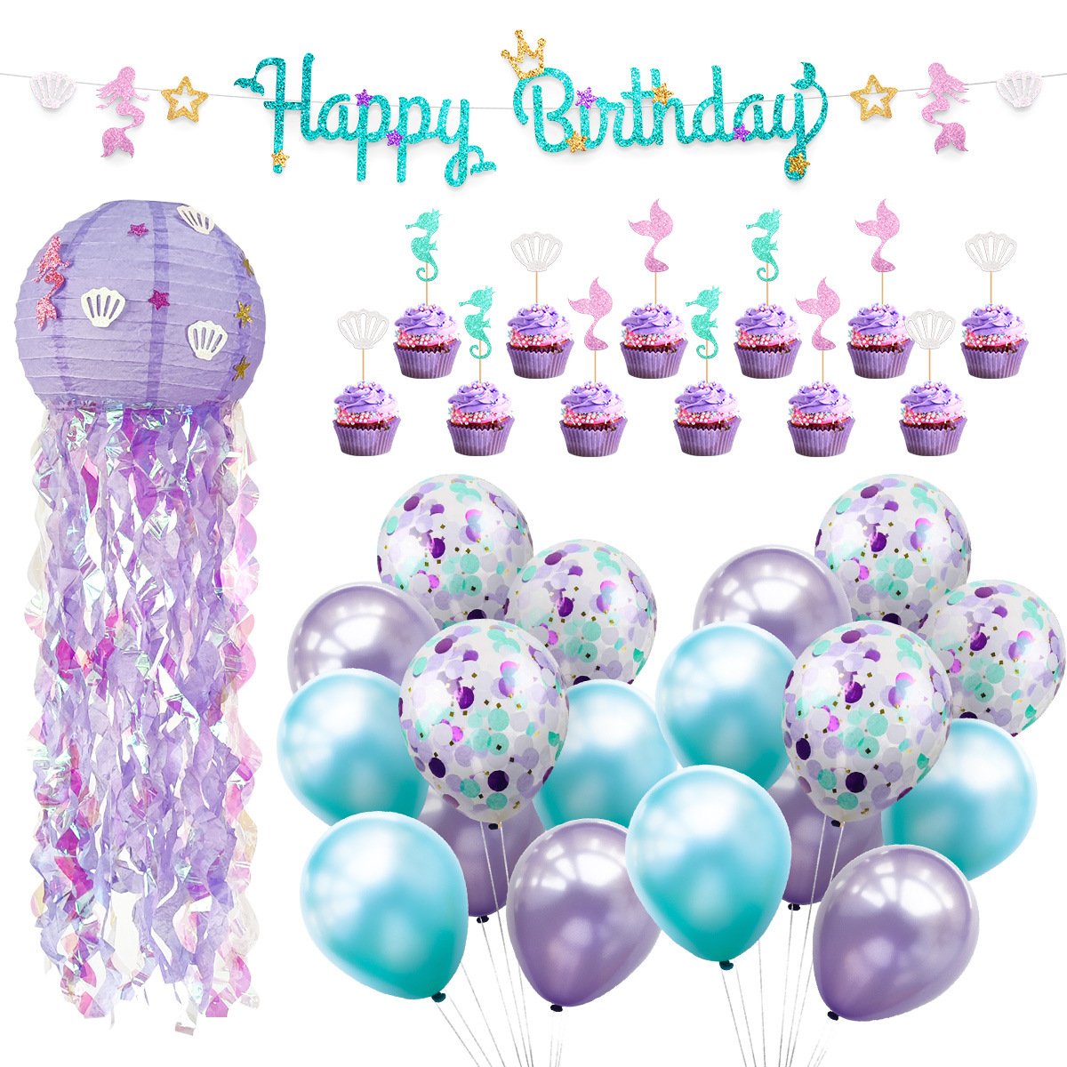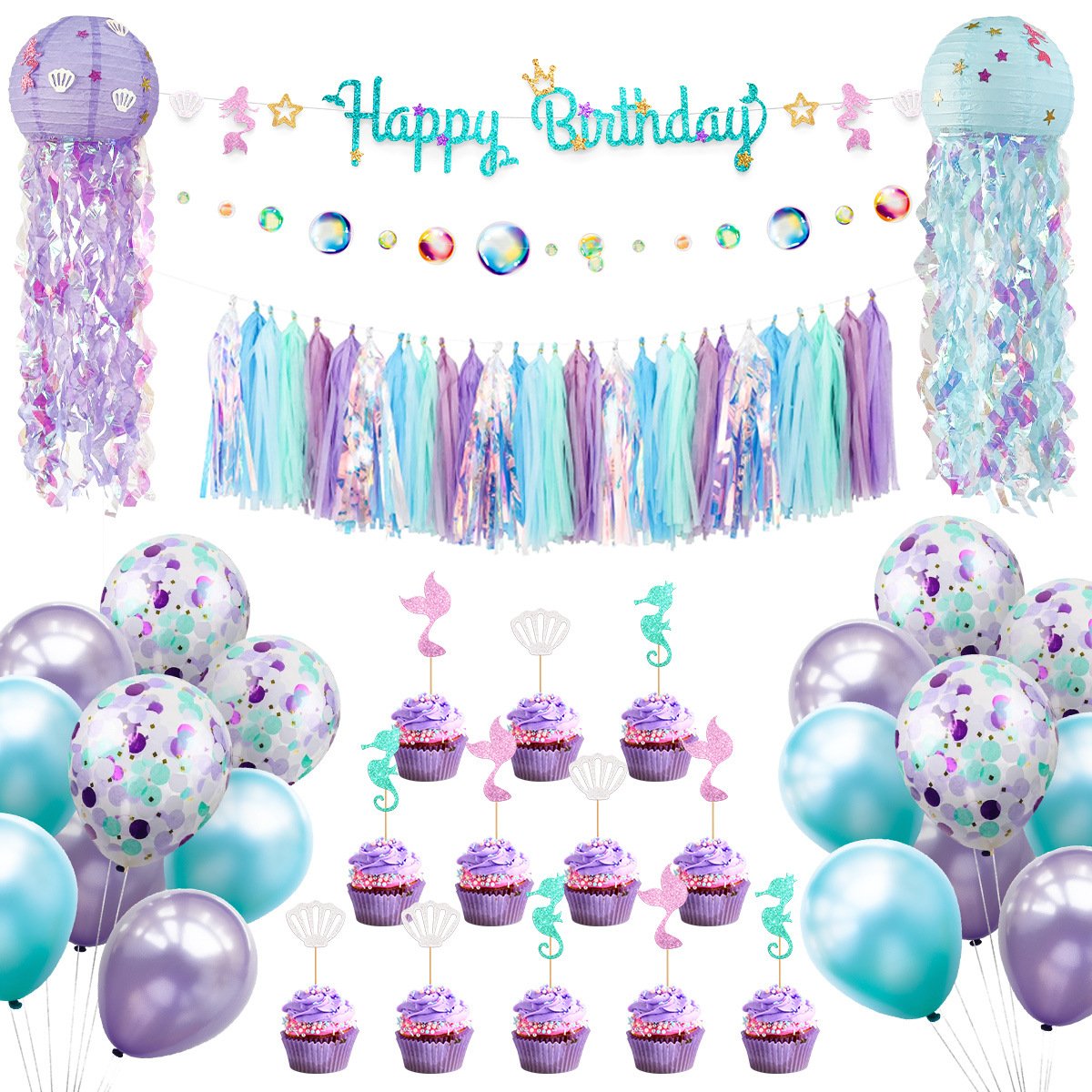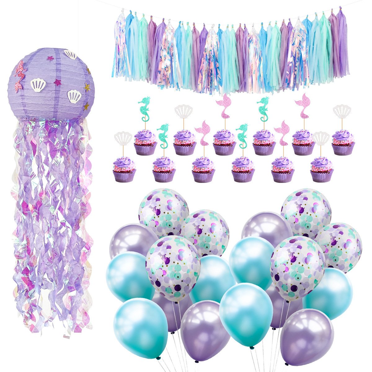 Mermaid-themed birthday party decoration set: jellyfish lanterns, banner streamers, tassel streamers, cake toppers wholesale