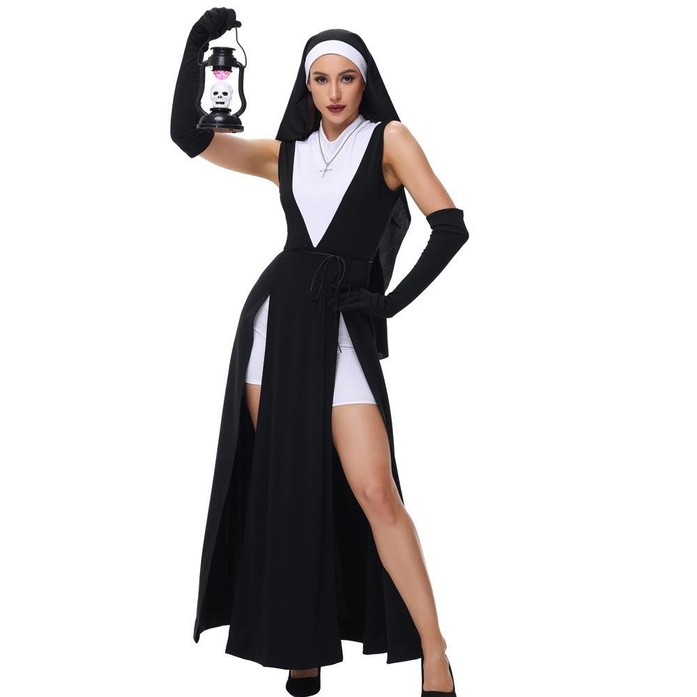Halloween Adult Nun Dress with Cross & Virgin Mary Design Dark Gothic Performance Outfit for Easter Cosplay